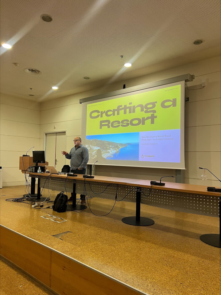 Οι φοιτητές μας είχαν την ευκαιρία να γνωρίσουν από κοντά τα βήματα, τις αποφάσεις και τις προκλήσεις που κρύβονται πίσω από τη δημιουργία της ταυτότητας ενός resort — από το πρώτο concept μέχρι την πλήρη brand εμπειρία.